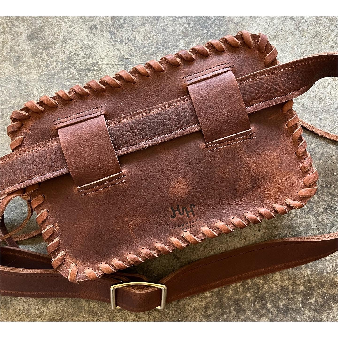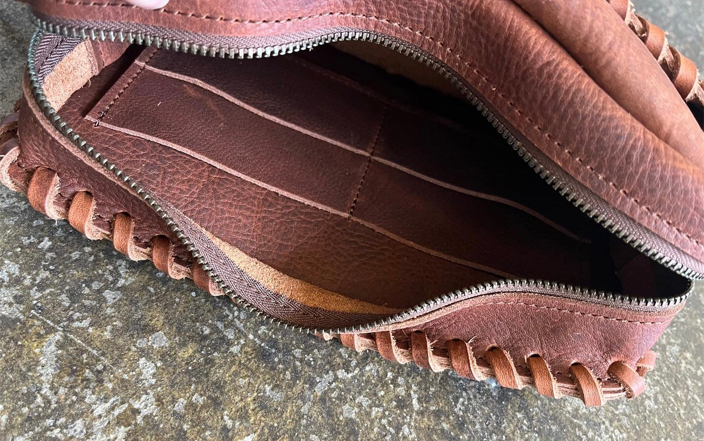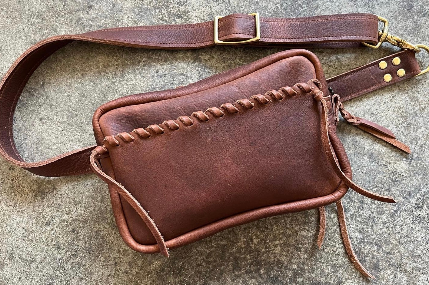 Convertible cross chest/hip bag. 8”x6”x2” with an adjustable belt/strap. Four internal card slots, YKK zipper closure with braided zipper pull, front slip pocket. Handlaced front pocket and back wall edge. Solid brass hardware.