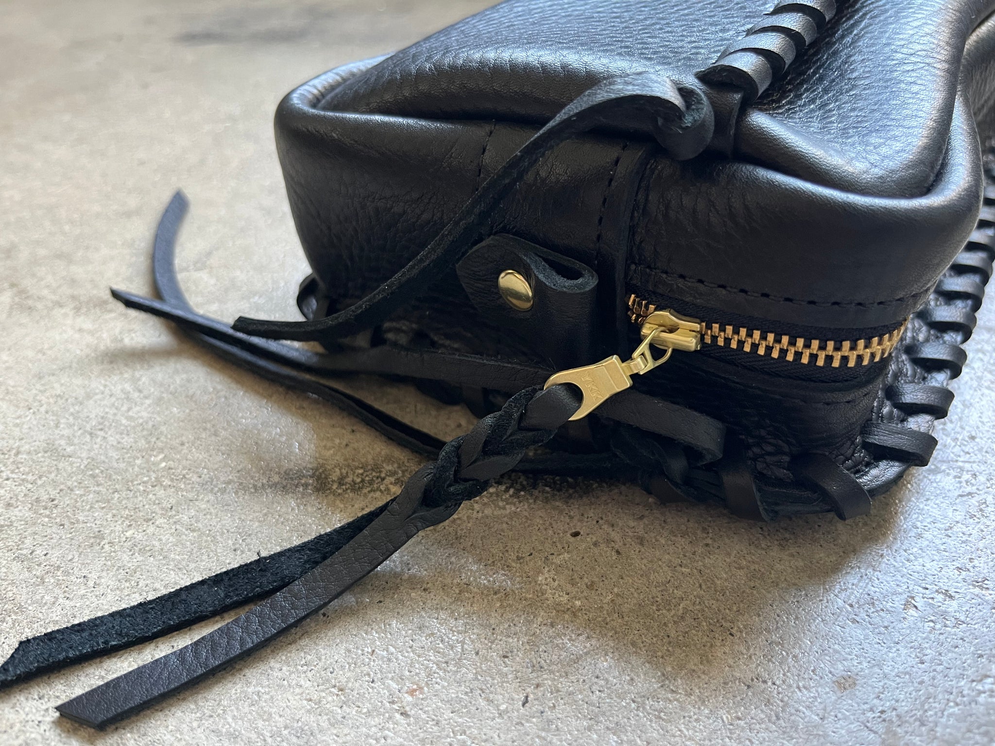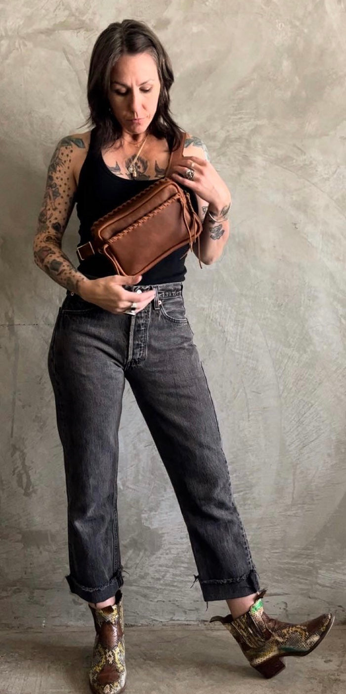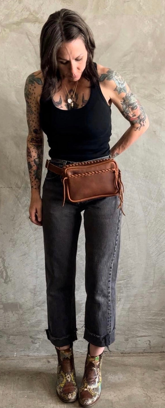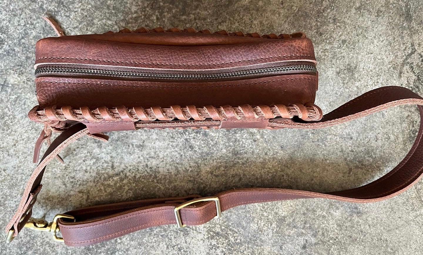 Convertible cross chest/hip bag. 8”x6”x2” with an adjustable belt/strap. Four internal card slots, YKK zipper closure with braided zipper pull, front slip pocket. Handlaced front pocket and back wall edge. Solid brass hardware.