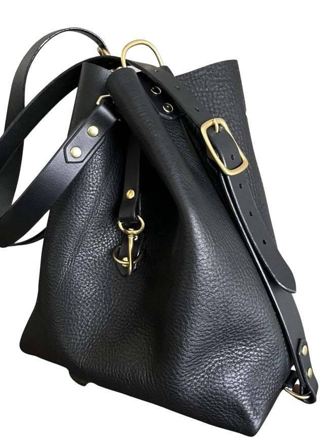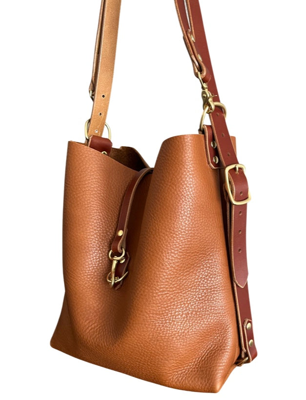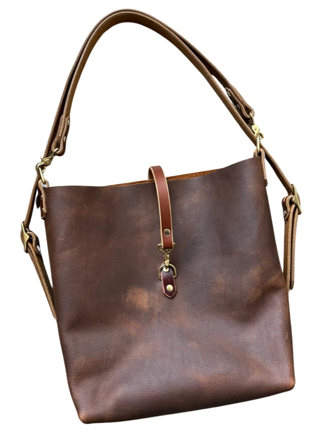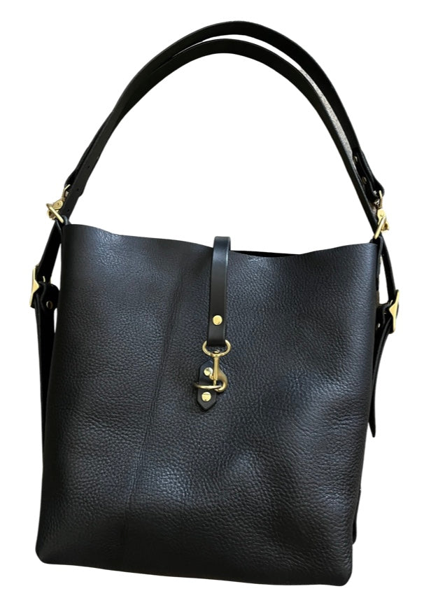 At 14” across at opening, 12” tall, with a 10.5”x4.5” boxed bottom, Huntley has sturdy 1” straps that are fully adjustable and there’s even an easy access clasp closure on the top. Large internal pocket. Unlined. Solid brass hardware.