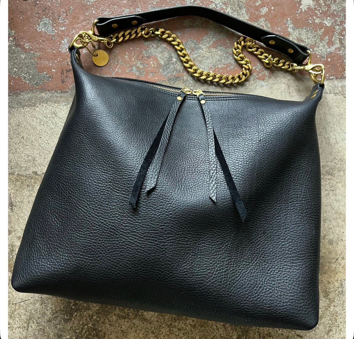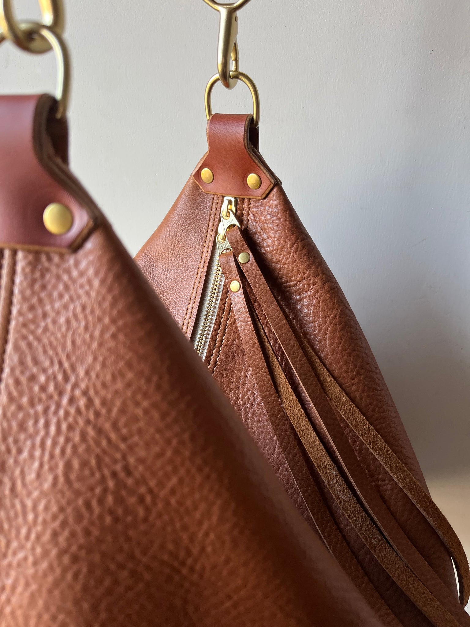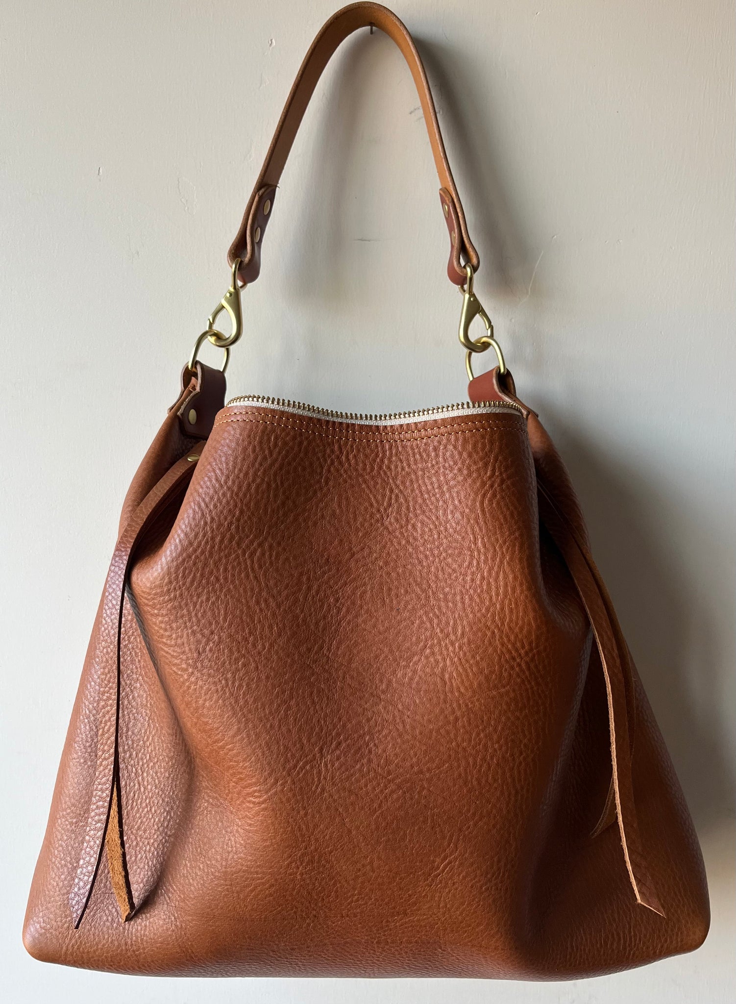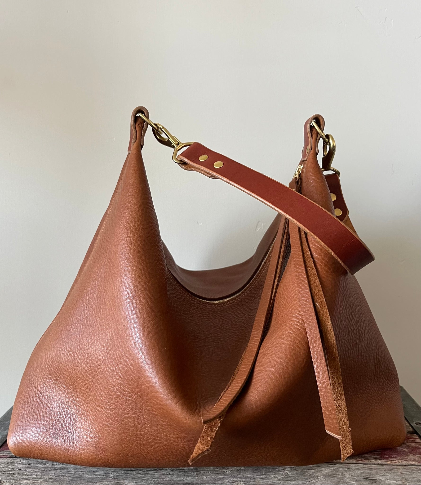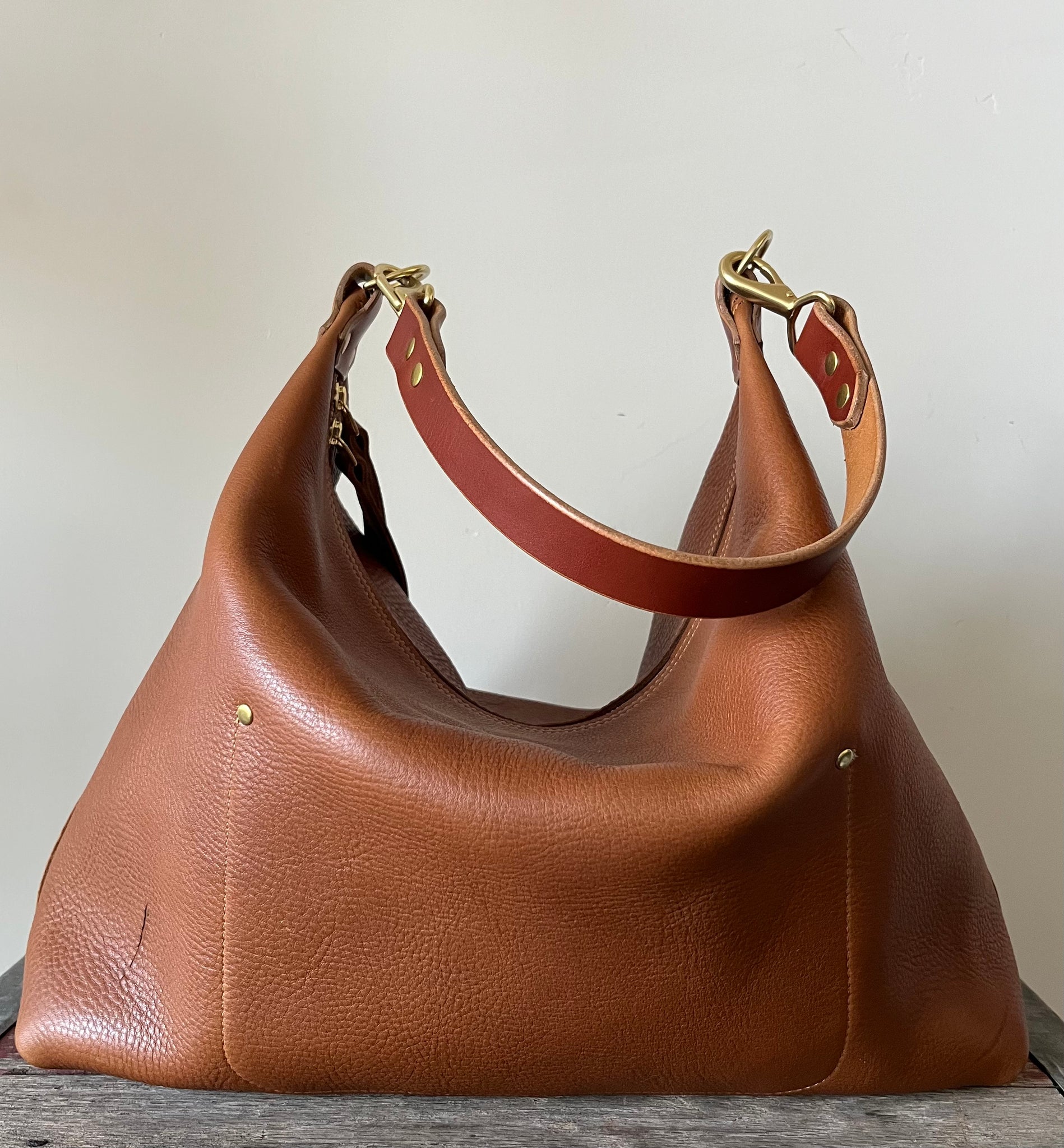 Leather is a natural and wild material, and every hide is different. Irregularities in color, texture, blemishes, and scratches not only occur but should be expected as they are part of the animal that they came from. These are not faults, but rather natural qualities of the hide itself. The leather that I use in my products is intended to naturally patina, show wear, and change with use and love. If you choose to protect your handbag with a spray or treatment, please be advised that it may alter the look and/or feel of your leather.