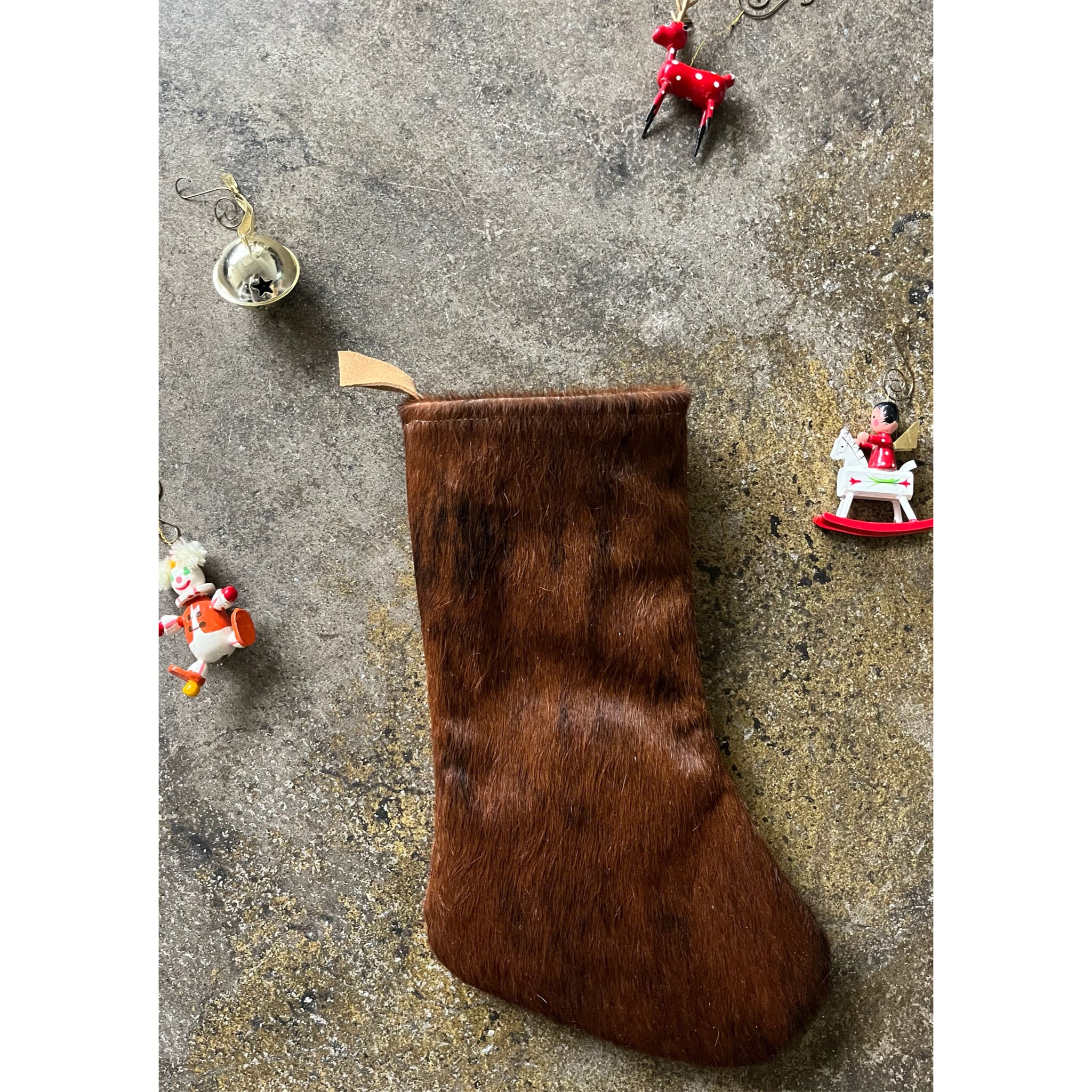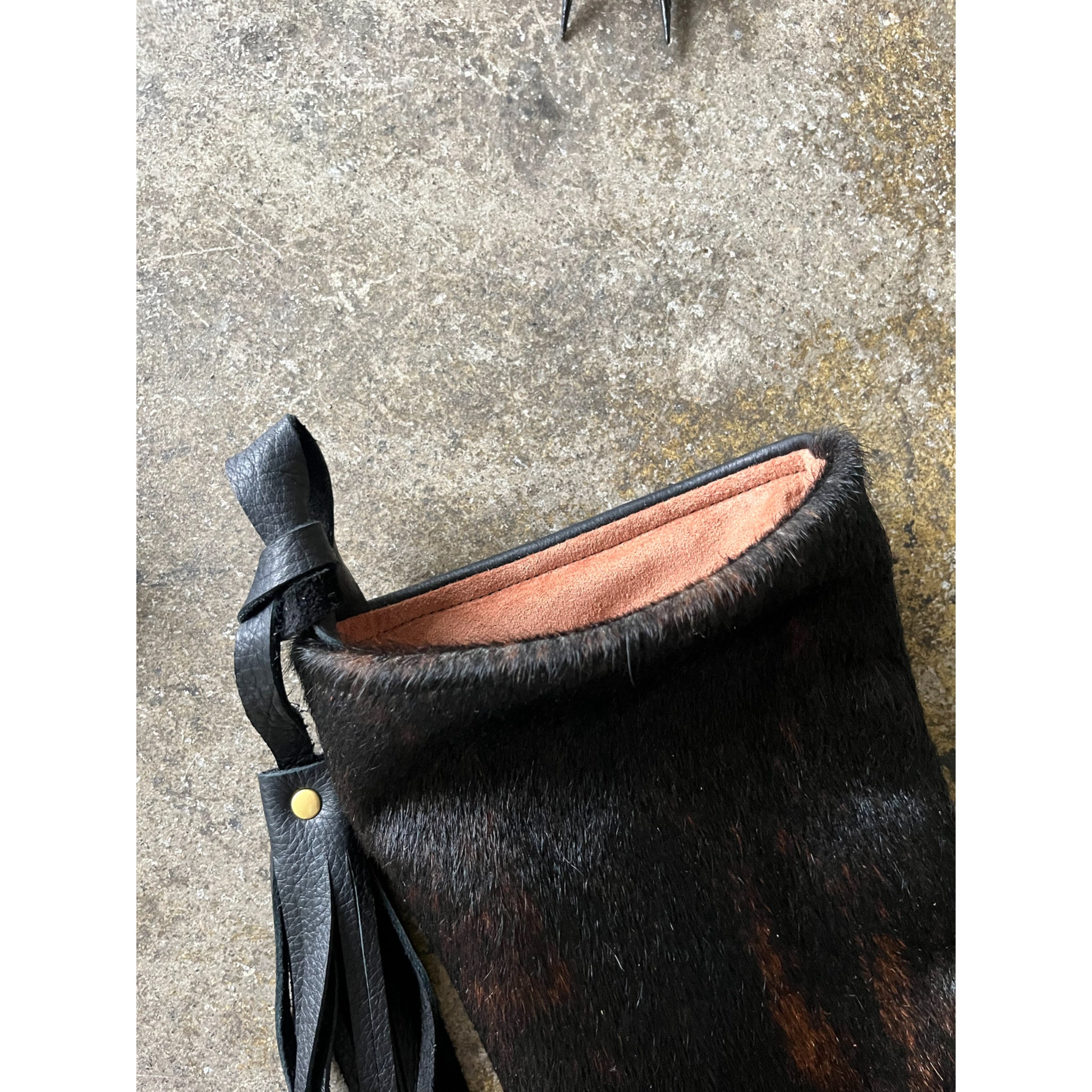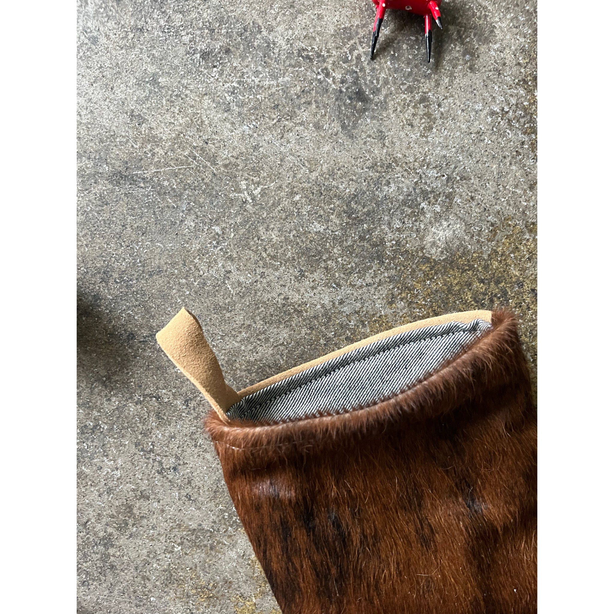 2) Hair on Hide brown. Suede back, lined with vintage selvedge denim.
