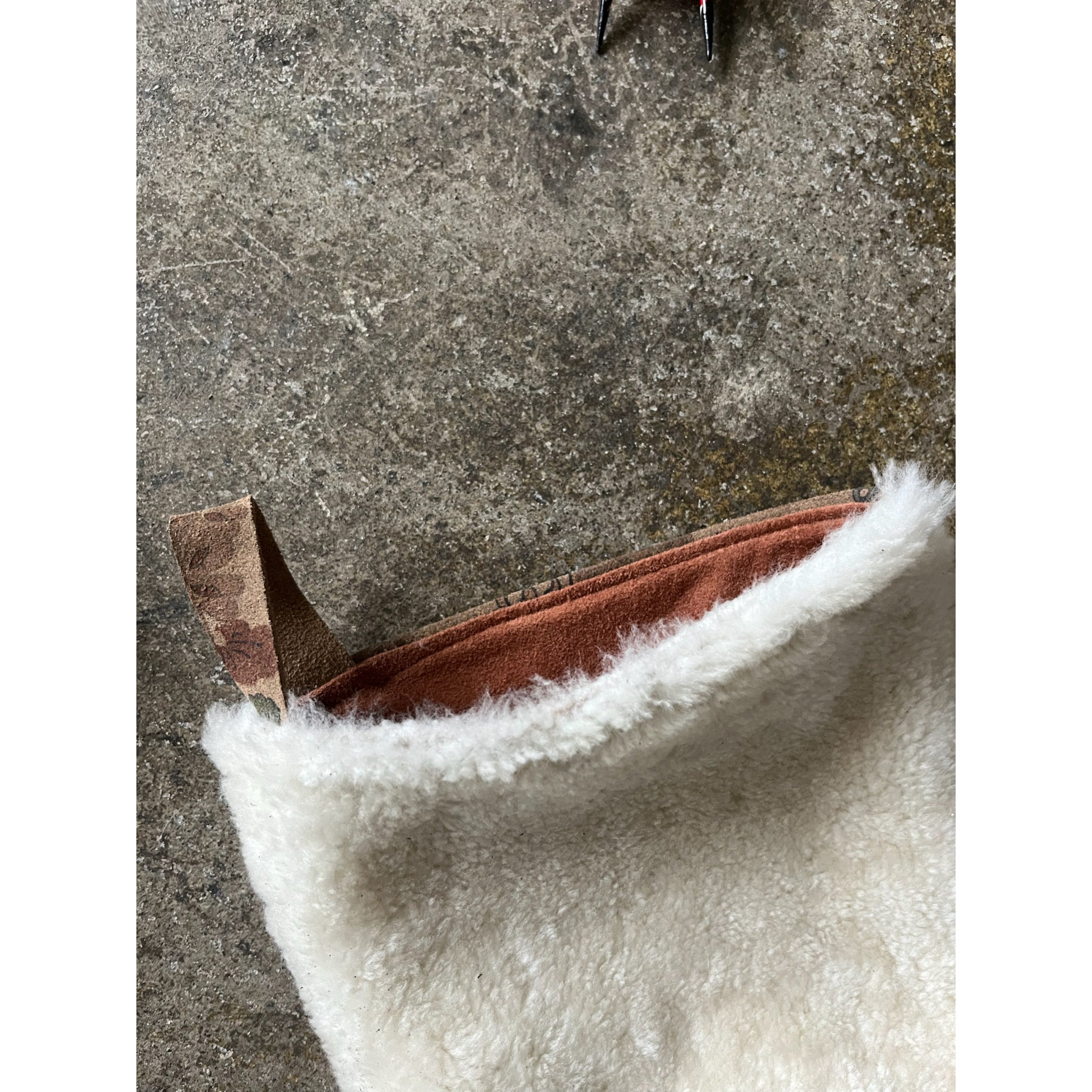 3) Shearling. Printed suede back, lined with soft suede.