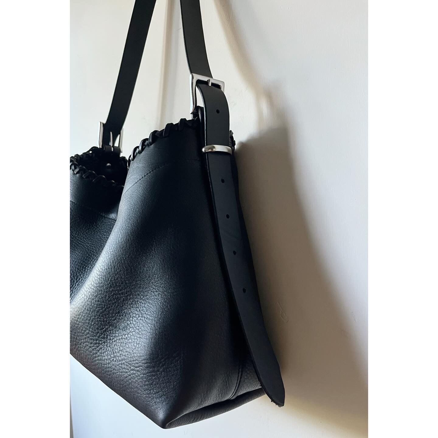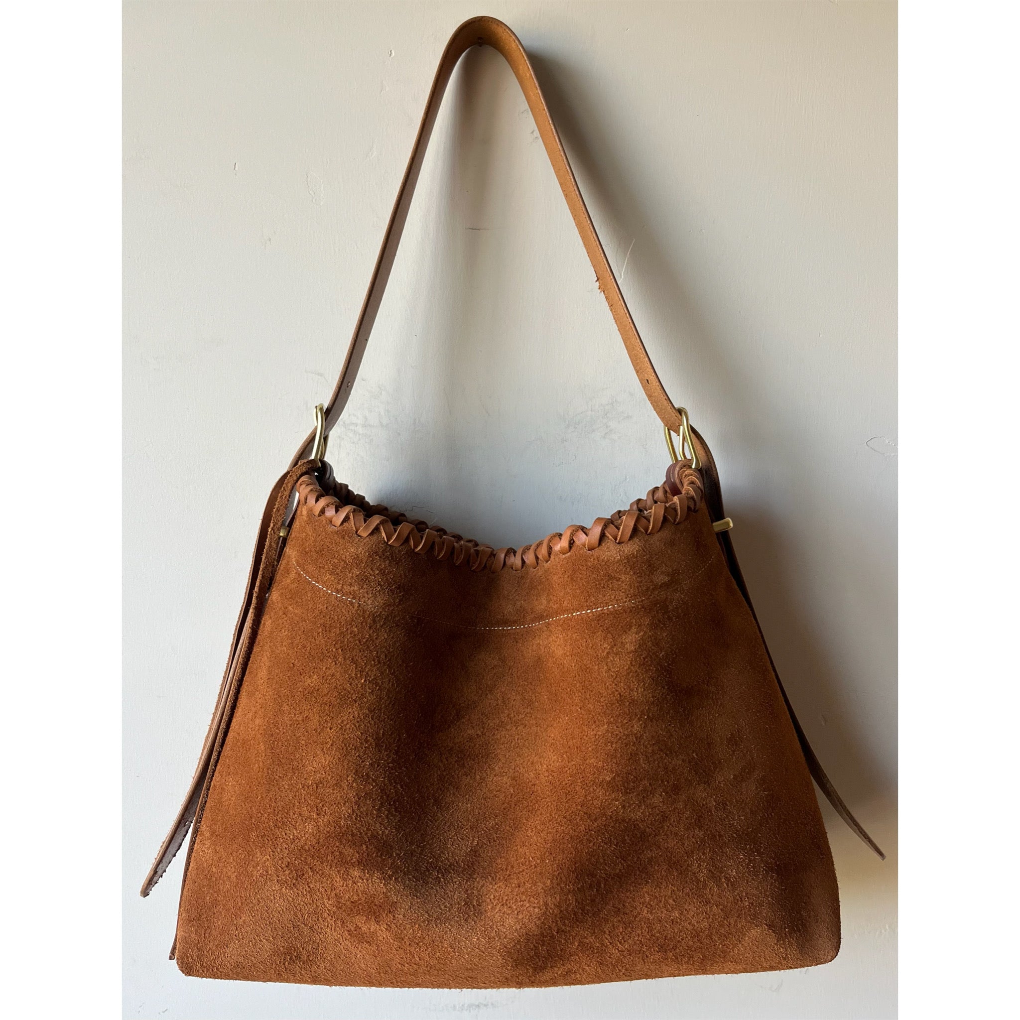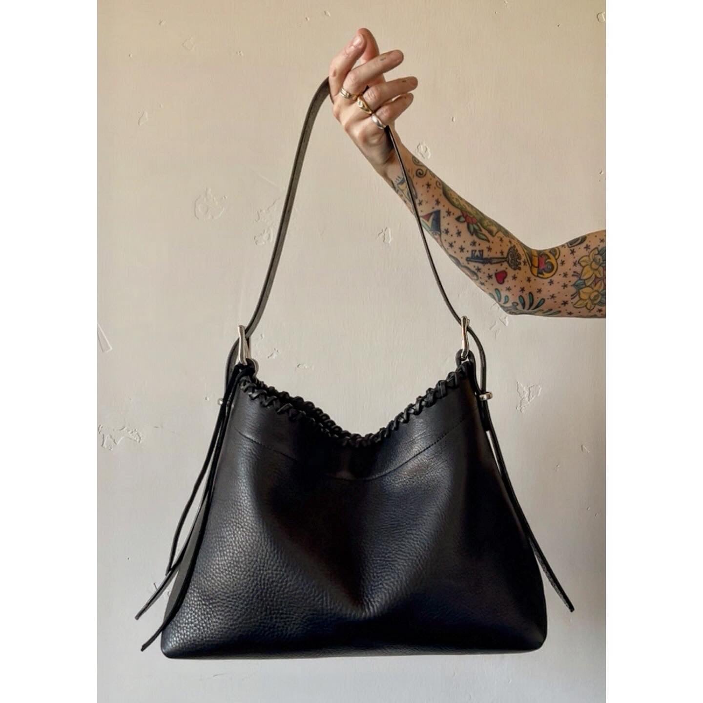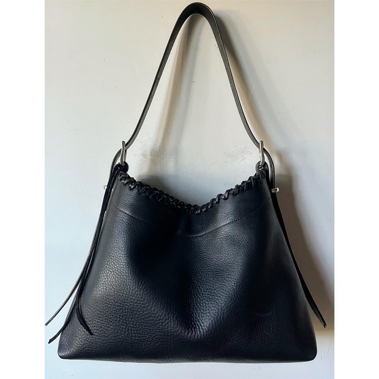 The TRAP features a sizeable base at approx 16” wide and 6” deep. The double cross cross handlaced top comes in without being constricting to 14” across laying flat. Top line gently slopes from 12” at sides to 10” center. It’s adjustable 24-44” strap is meant to leave excess draping down sides of bag when worn shorter. Internal and external slip pockets, clip/d closure, solid brass hardware. This bag is unlined.